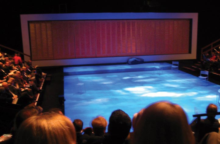 The set imagines the Italian villa, somewhere between “The Godfather” and the Italian architect Guiseppe Terragni. The elements are all compressed within the frame of a minimalist house that slowly opens up in layers as the play progresses. A combination of artifice and naturalism is choreographed around a “pool” of sky which functions as the filed for confrontation, marriage and death.