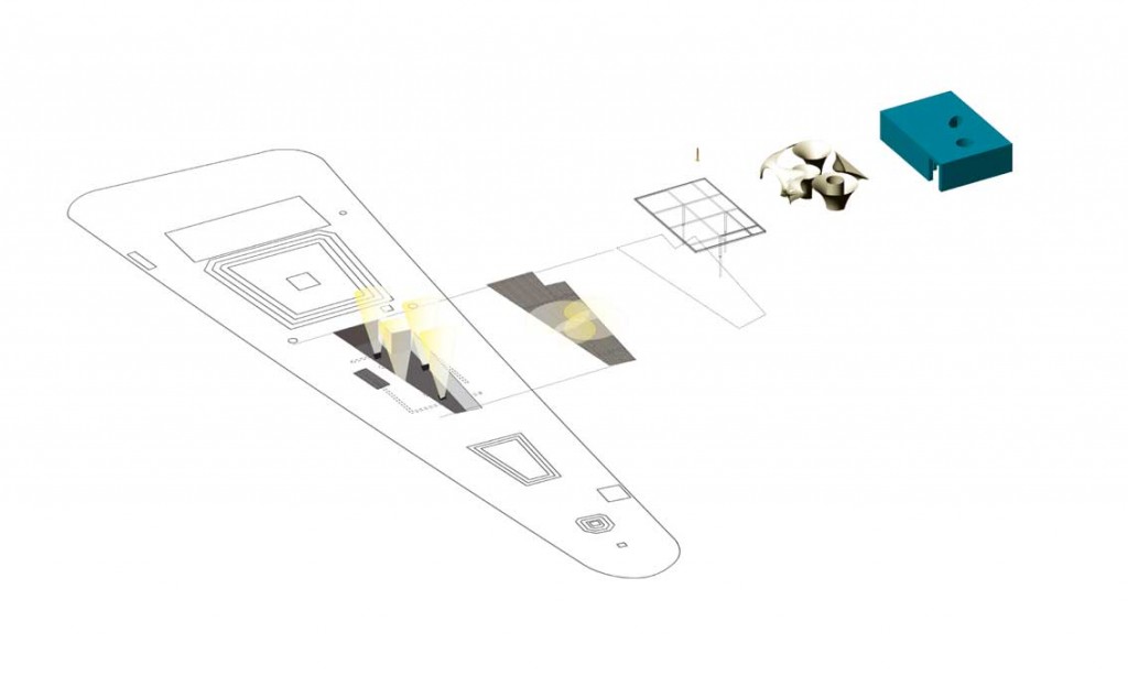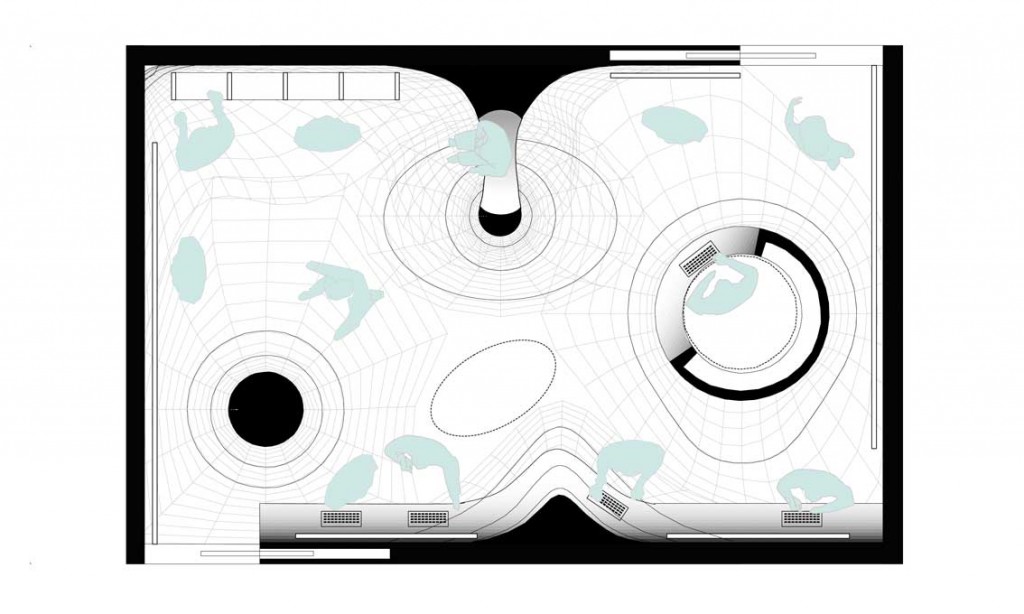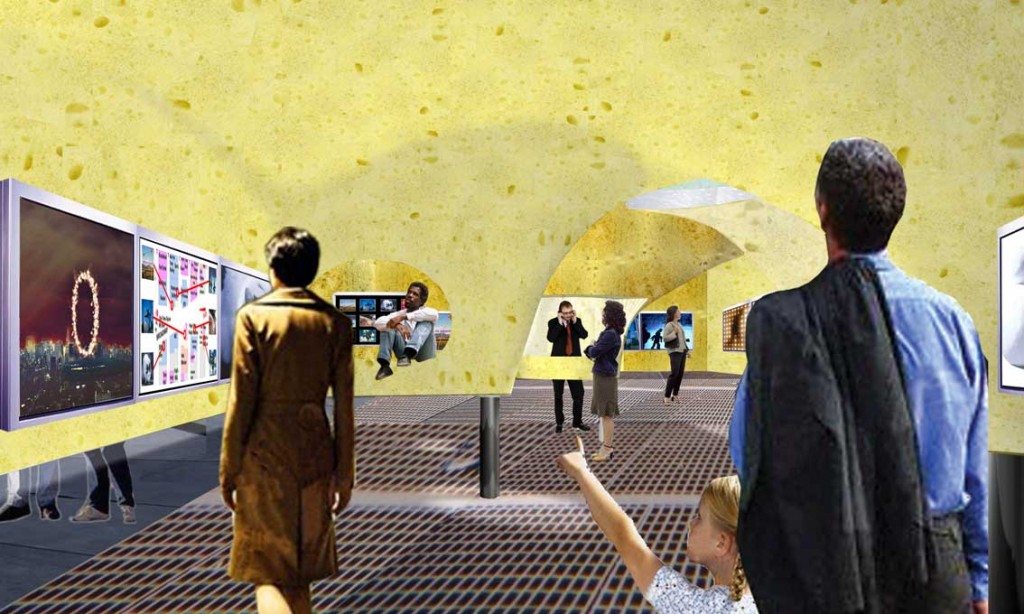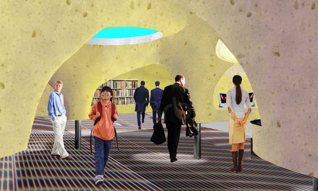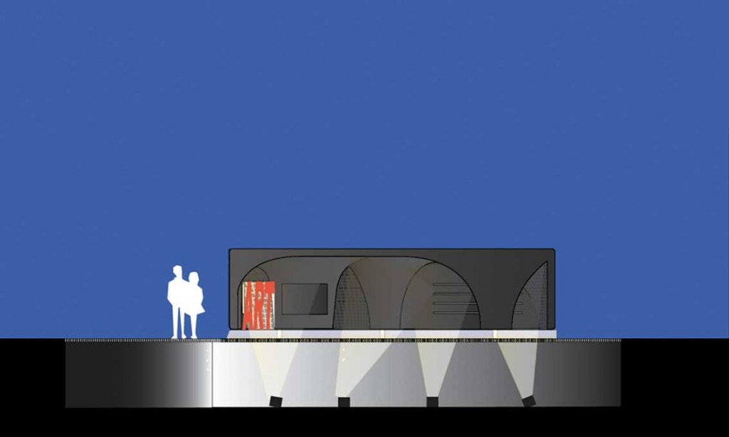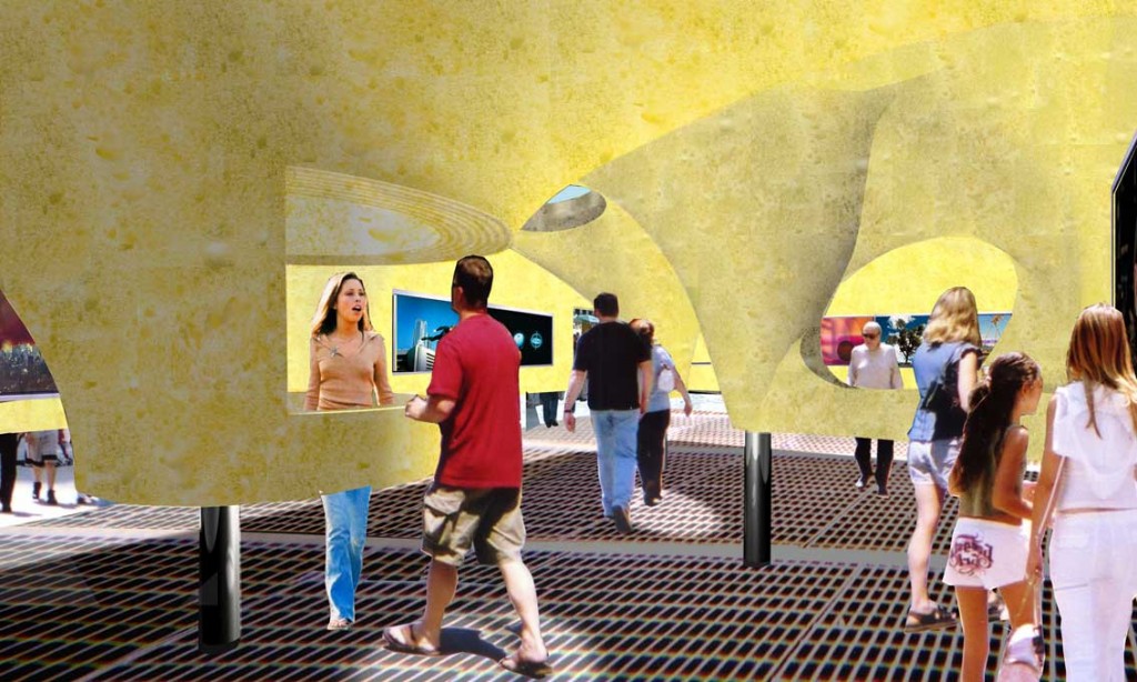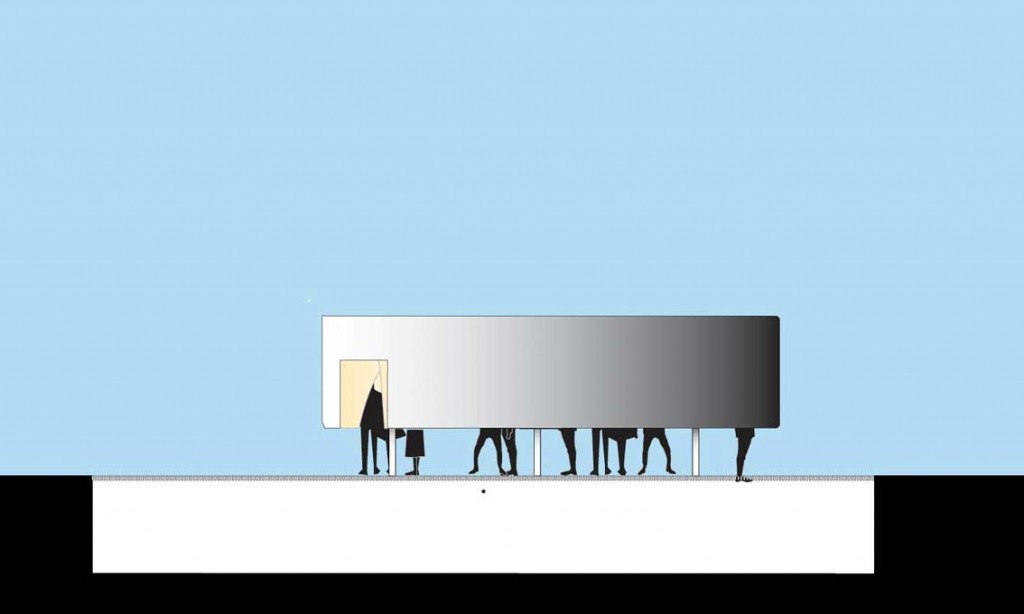 The proposal is a floating silver box that hovers three feet above the existing subway grating. Entering by way of one of two openings in the sides, one is immersed in a completely different environment: a cultural grotto in the center of Manhattan. Gently curving display walls, sound environments, an arts library and skylights exposing a bare sky without skyline are designed to allow visitors an entirely different spatial experience.