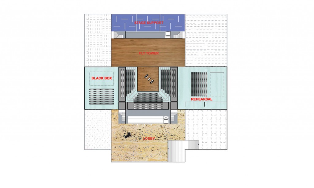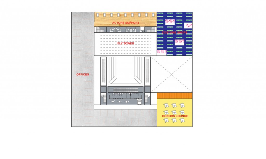 Above and below the main theater, office space and rehearsal spaces, loading docks creates a sandwich that defines the buildings footprint. The Dallas theater was eventually redesigned around the same parameters and built in 2009.