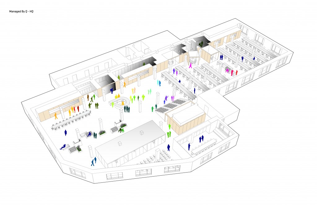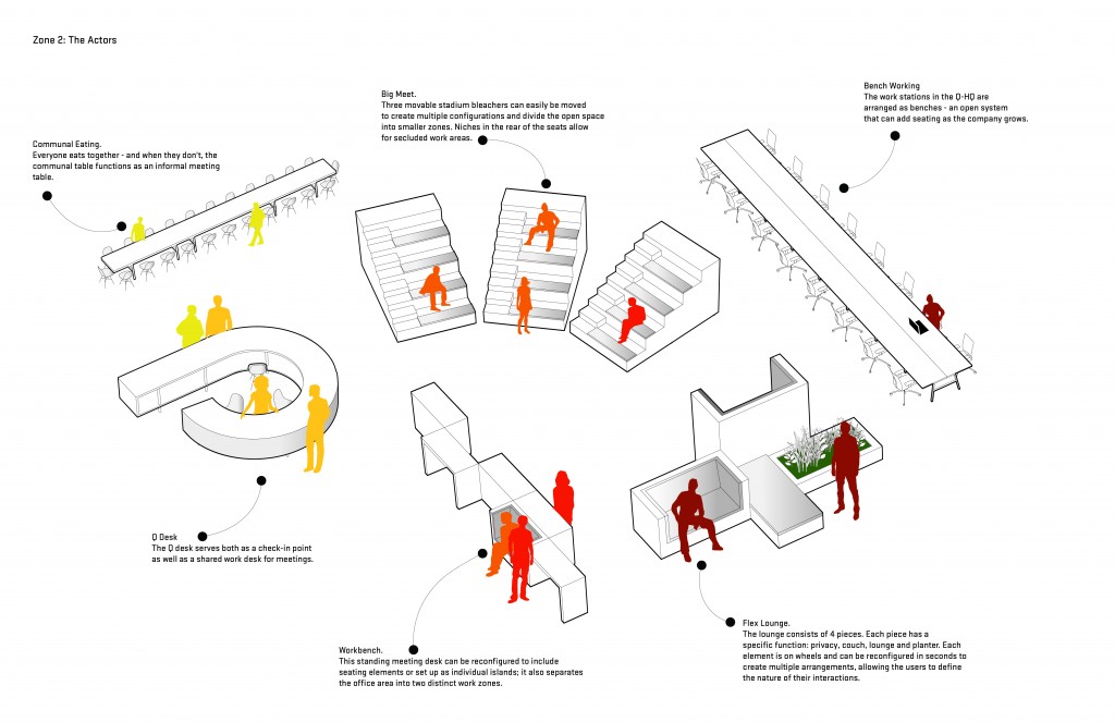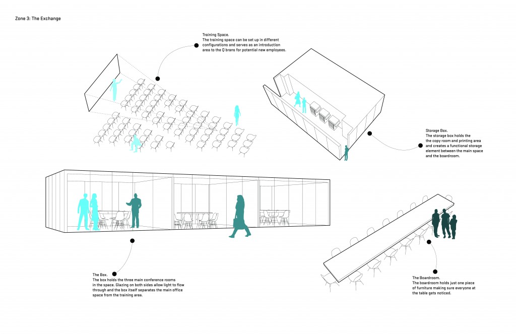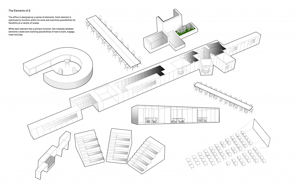The flexible office space allows for a continuous ebb and flow of activity throughout the day with the only fixed element being the centrally placed Q station, a combined standing meeting and reception desk that act as a fulcrum for the diversity around it.