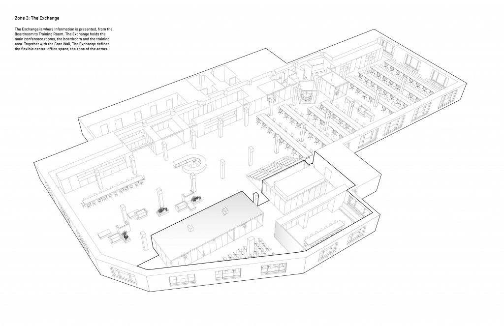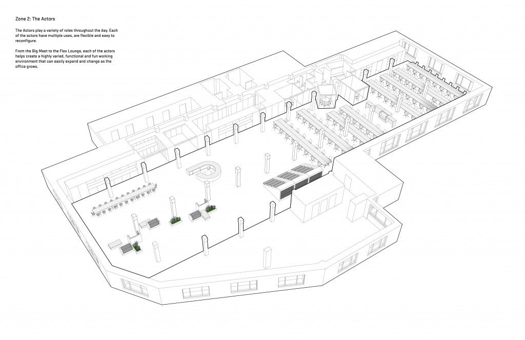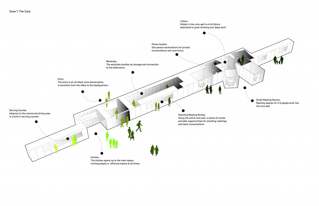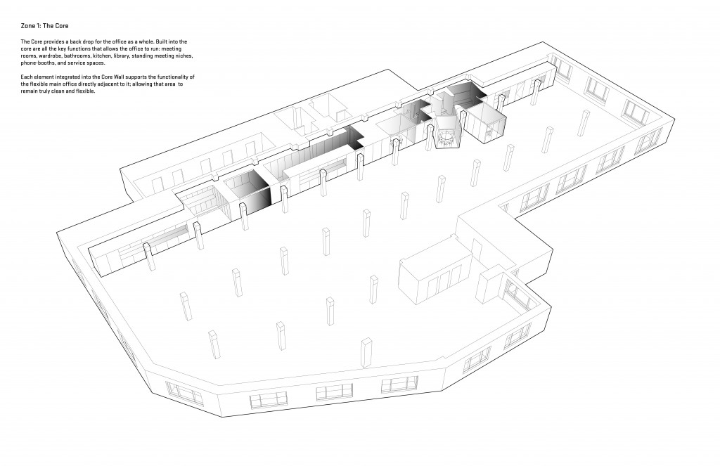 As a backbone to the flexible main space, the fixed, programmed, back wall provides all the key elements needed to run the office efficiently on a daily basis along with a few hidden spaces for the employees to use.