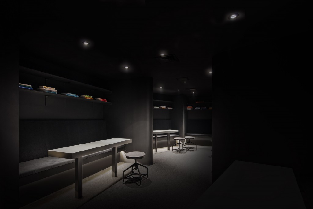 Towards the main space, along the full length of the back wall, a series of corian-clad niches provide room for impromptu standing meetings as well as serving stations for events. Carved into the wall, hidden away from the hectic activity of the main space is a working library combined with individual phone booths for deep work. In addition, the wall creates specific niches for the kitchen, wardrobe, bathrooms, IT rooms and smaller staff meeting rooms.