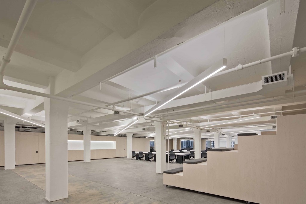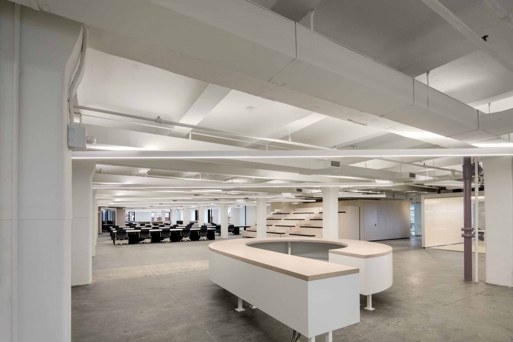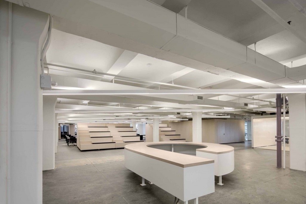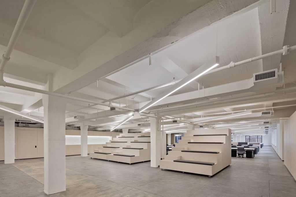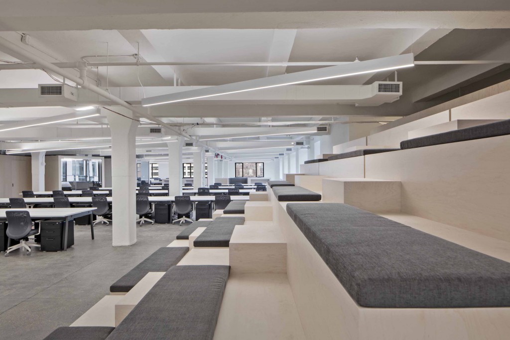 Within the main space, movable full-height raked seating bleachers can be rolled around to physically alter the main space in scale and set up a variety of configurations ranging from smaller scale meeting areas to the monthly all-hands gatherings for hundreds of people.