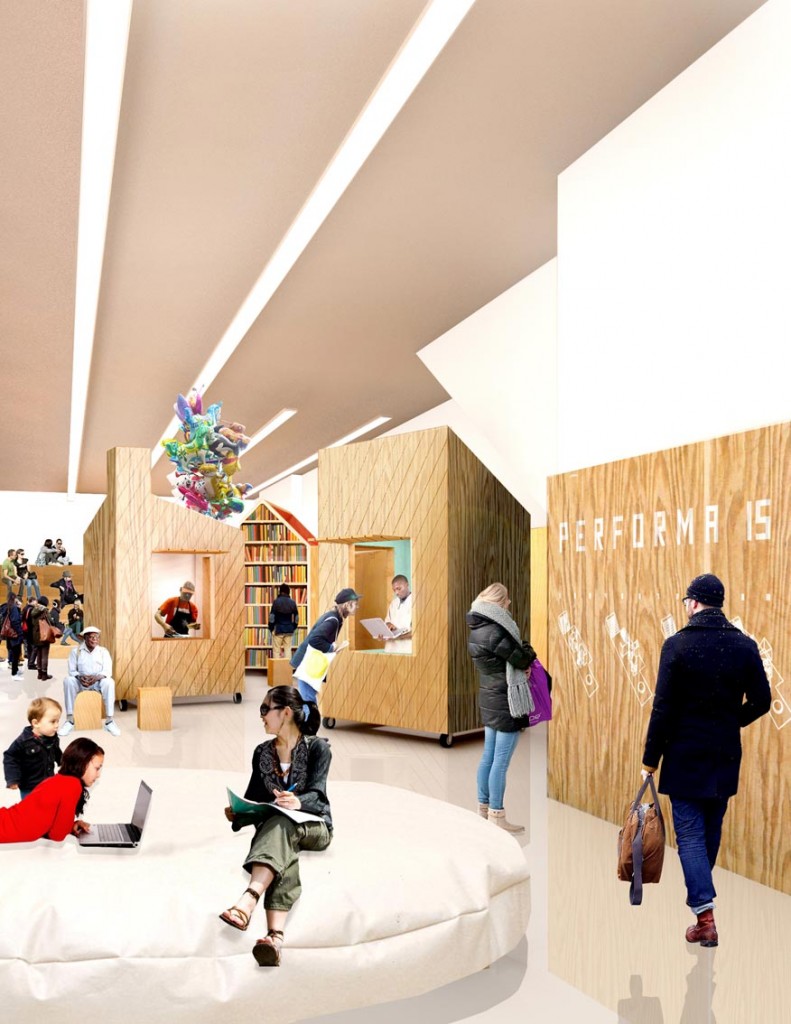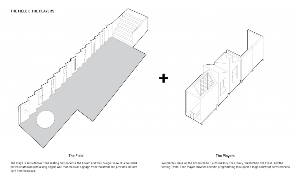 The Performa 15 Hub proposes a merger of design and performance, a Performa City with architecture as performers, composed of two theatrical and architectural archetypes: the Players and the Field.