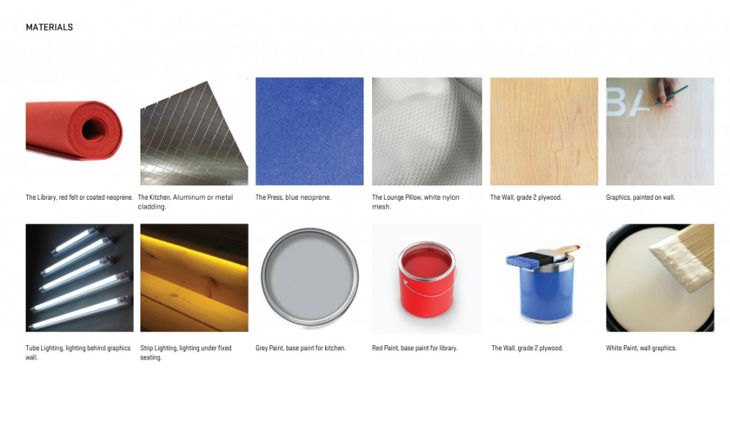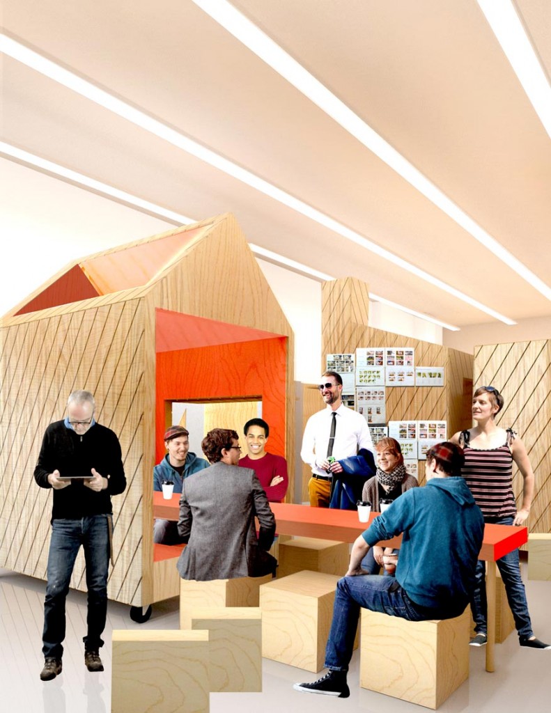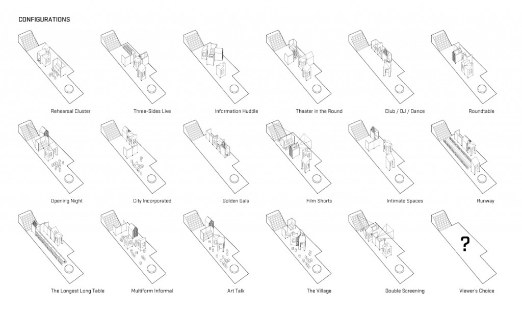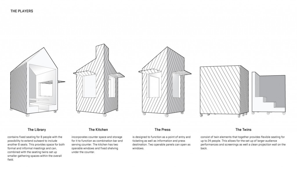 The Field defines the stage for the Players, adding a combination of fixed elements as a backdrop for the changing Player configurations. In the front, the lounge pillow provides opportunities for casual meetings; in the back the forum creates a backdrop for larger performances. The five Players each hold specific interior program and lighting, can be opened to create dynamic relationships between interior and exterior, can be moved to set up flexible spaces, serve as projection backdrops, or simply nest along the edge of the Field to allow for a clean space.