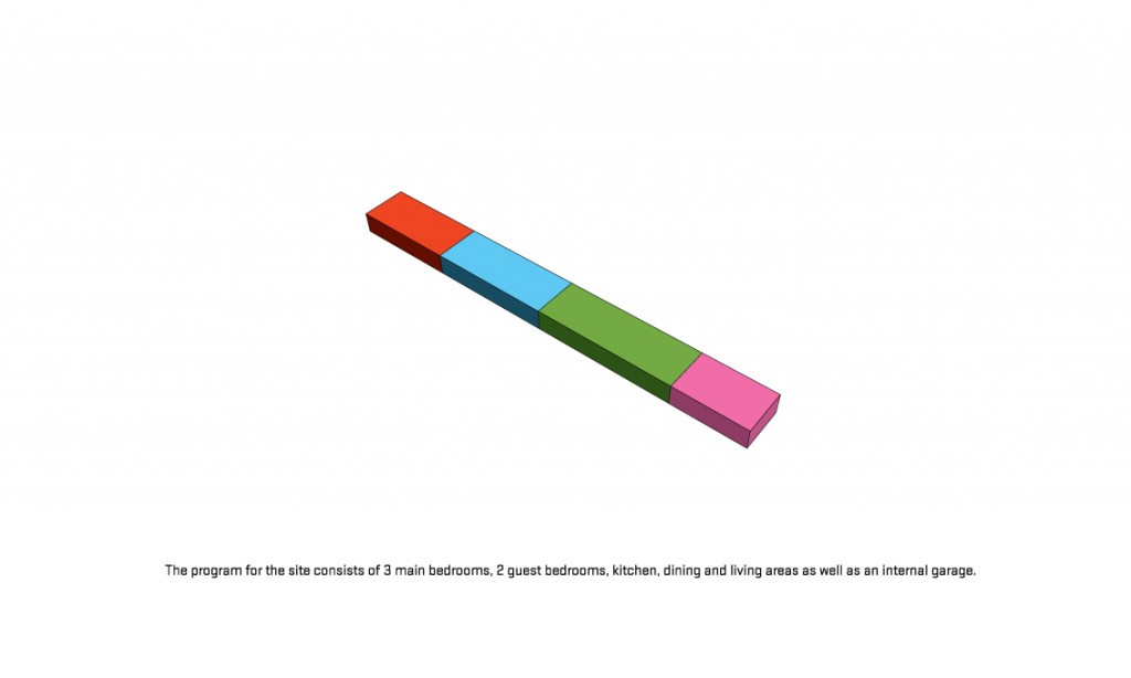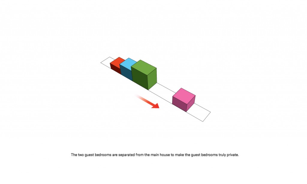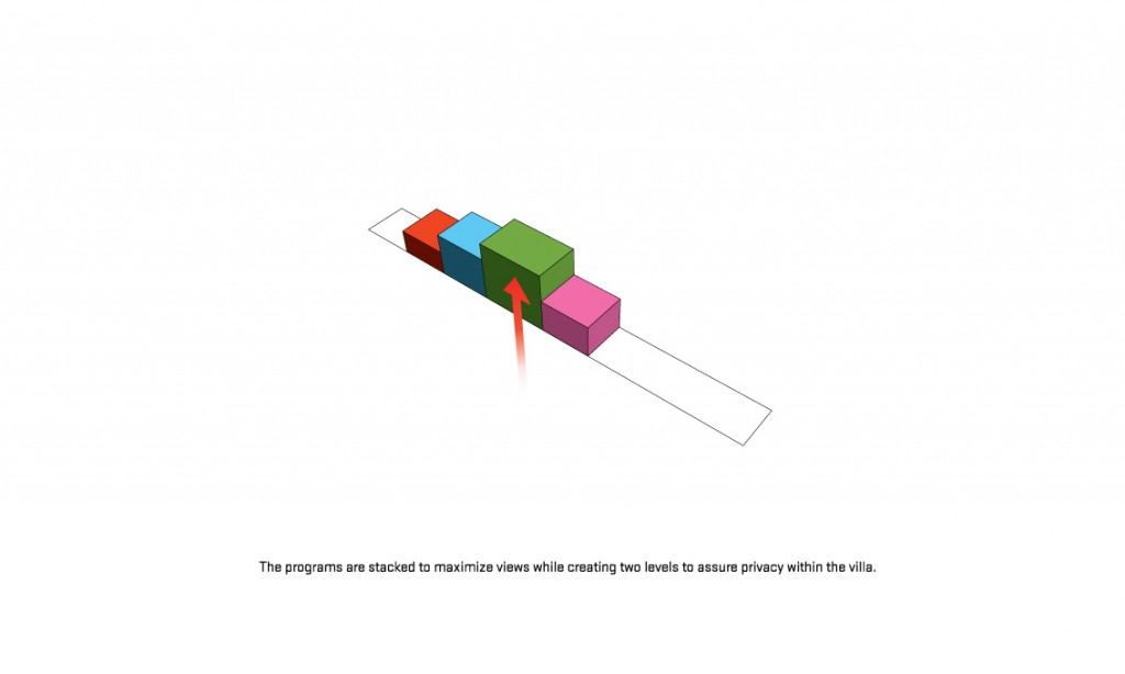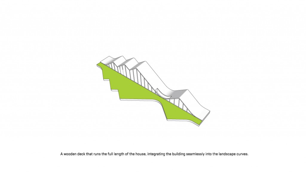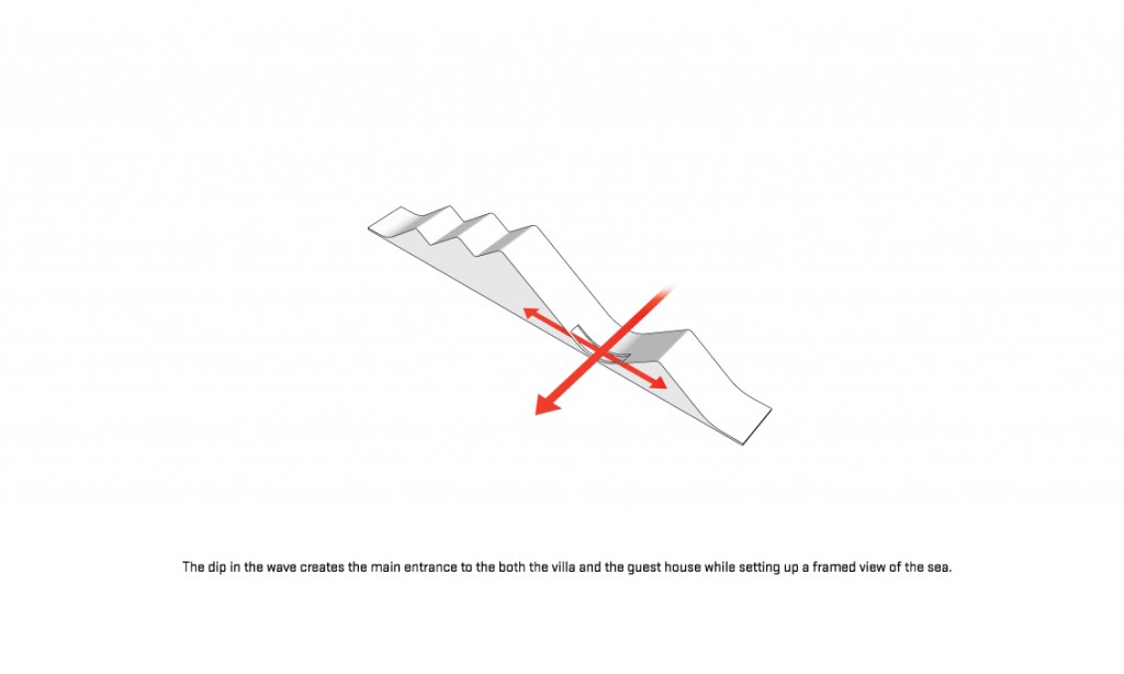 The villa has three bedrooms as well as two guest bedrooms. On the ground floor of the villa, an interior garage space connects directly to the kitchen and from there, the dining and living room. On the upper level the master bedroom and two children’s bedrooms have separate bathrooms.To allow for maximal privacy for both the family and guests, the guest residence is pushed out from the main building and connected by the undulating roof. This sets up the buildings unique roof shape and creates a natural centralized entry point that frames views of the setting sun.