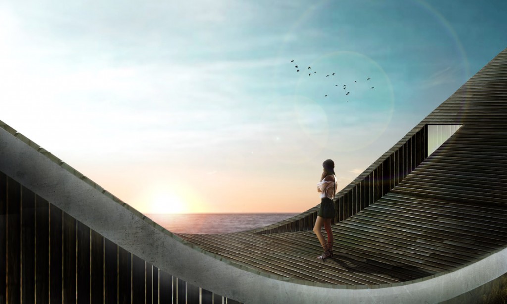 The design of the villa takes its cue from the rolling waves of the North Sea and the surrounding dunes, creating a layout that connect seamlessly with the open landscape and set up spectacular views of the water. All he interior rooms are arranged along a North / South axis with each room overlooking the sea and beach directly with direct access to the exterior terrace that runs the full length of the house.